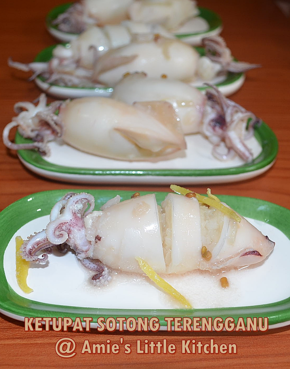 Seperti biasa, sambil masak lauk hidangan tengahari, sambil-sambil pula godek-godek pulut kukus sumbat ke dalam perut sotong. Bila makan tengahari, Encik Suami tanya, bila boleh dimakan sotong tu? Oh! Amie pun angkatlah separuh, dan tinggalkan beberapa ekor di dalam kuali! Lepas makan, Amie pun ambillah gambar Ketupat Sotong Terengganu mana yang tinggal tadi tu...