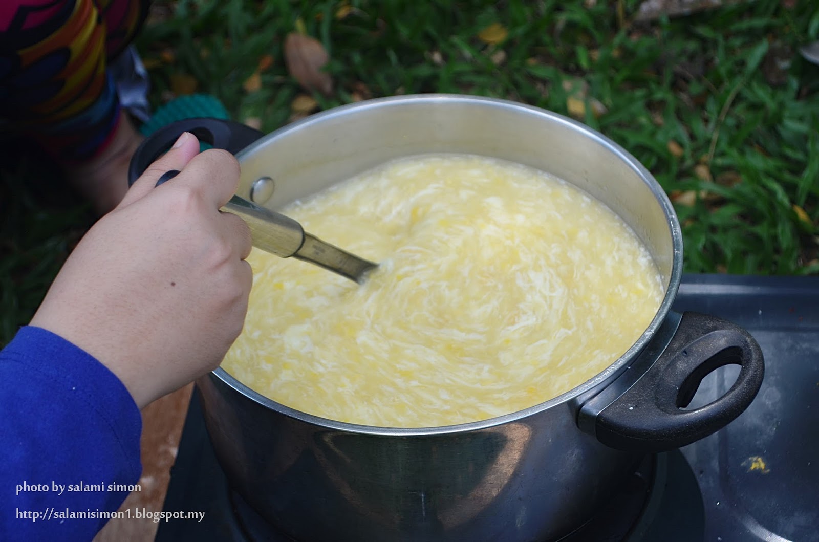 Sementara itu kita beralih ke tempat lain pulak. Sentuhan akhir untuk sup jagung.... masukkan telur sambil kacau rata. Tutup periuk dan padamkan api dapur! Siap!