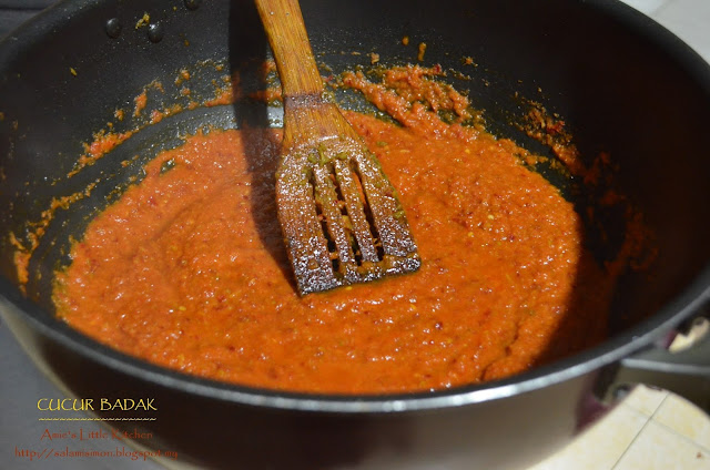 minyak dan tumis semua bahan kisar termasuk udang kering sehingga pecah minyak.