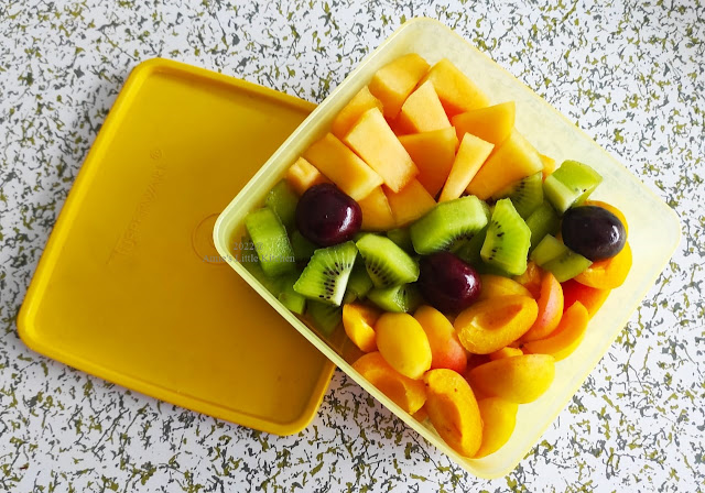Hari ini balik lewat sedikit kerana kena hadiri mesyuarat . Bawa bekal berat, nasi goreng dengan ayam panggang air fryer. Tidak ketinggalan salad dengan kombinasi yumak, butterhead lettuce, potongan avokado dan tomato ceri. Penyerinya sama saja seperti biasa, taburkan bijan hitam. Tak bubuh kuah salad @ salad dressing. Walaupun hitam nampak menawan....ahaks! Hirisan buah tidak dilupakan. Kita susun potongan rockmelon. Buah kiwi pula diapit oleh buah aprikot. Untuk timbulkan keceriaan, selitkan buah ceri beberapa biji.