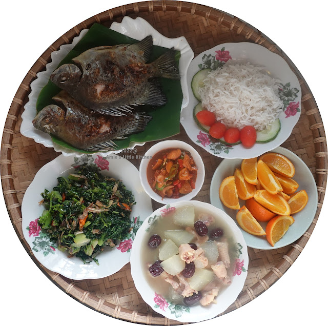 Sekarang ada kesempatan untuk kongsikan menu hidangan makan tengahari merangkap makan malam kami. Seperti biasa, Amie masak lauk-pauk kampung. Kali ini Amie panggang ikan kitang, tumis pucuk betik dan renih sup ceker bersama labu kundur dan kurma merah.