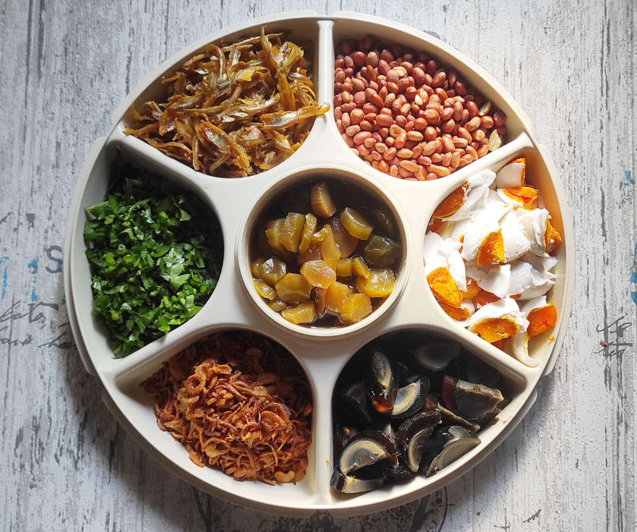 Asas lauk bubur nasi biasanya hanya ikan bilis goreng, kacang tanah, telur masin, jeruk lobak , daun sup dan kicap lada. Yang lain itu boleh tambah ikut citarasa.