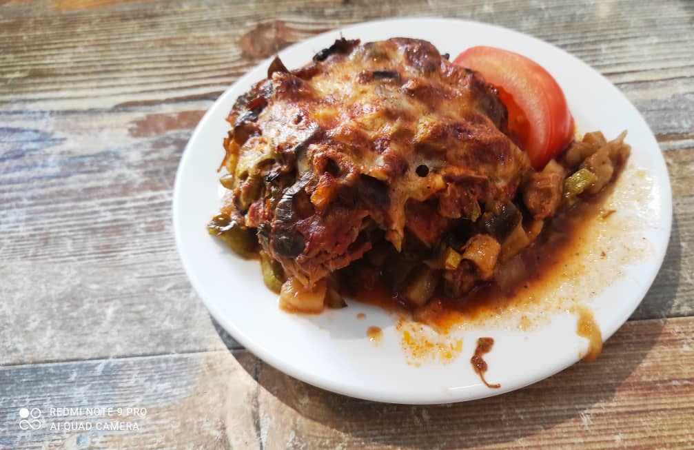 Jom kita selak roti yang menutupi makanan di bawahnya. Wah, nampak meriah rupa Adana (Kofte) Kebab! Ada campuran salad berwarna-warni, kebab daripada daging biri-biri cincang dan bulgur pilaf. Bulgur ialah sejenis bijian gandum.